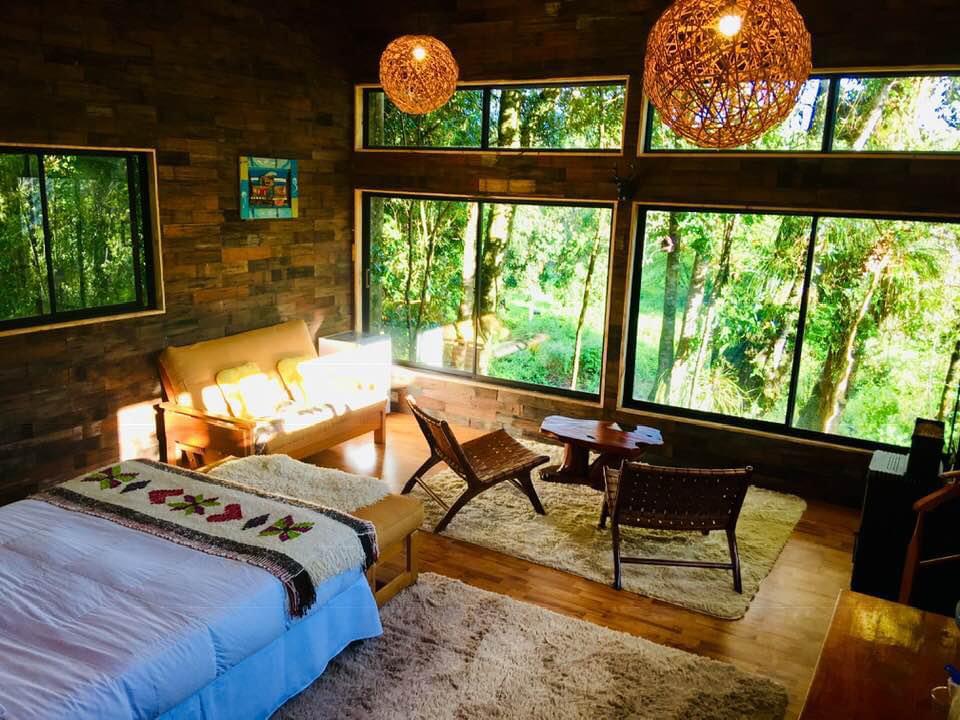 Cabaña Premium tipo Loft, inmersa en el bosque del sur de Chile. Con tina caliente en terraza de uso exclusivo. Vista al bosque y al río.